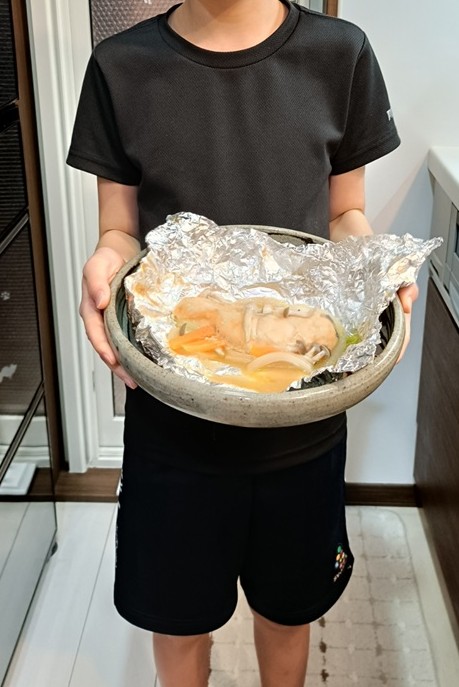 包丁の扱いは妻がしっかりサポートしながら、息子自身が調理しました。
